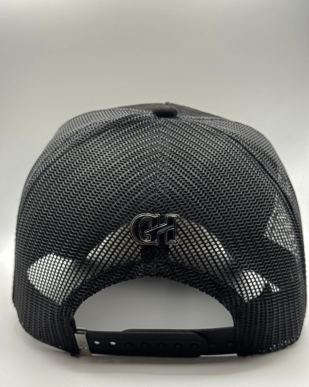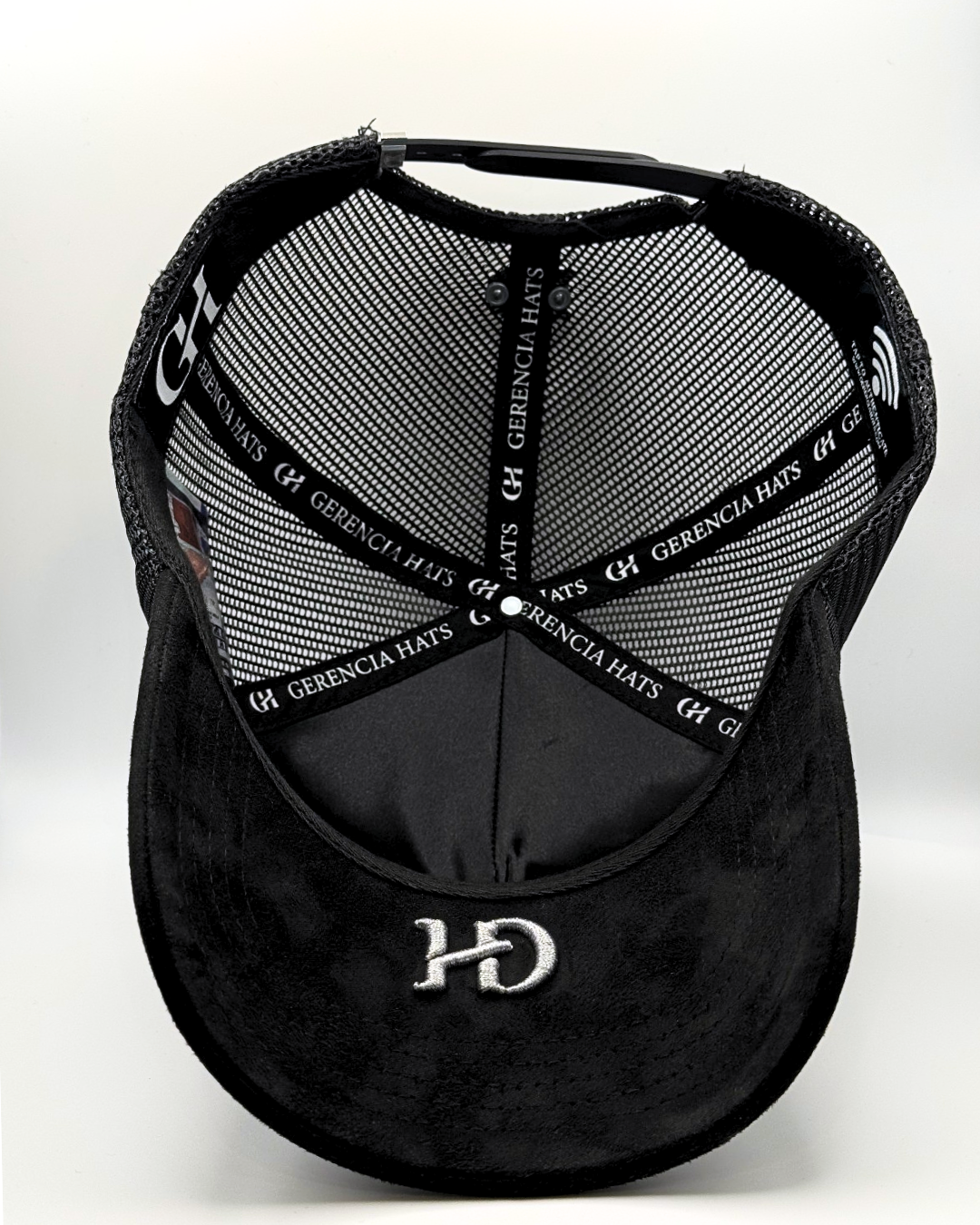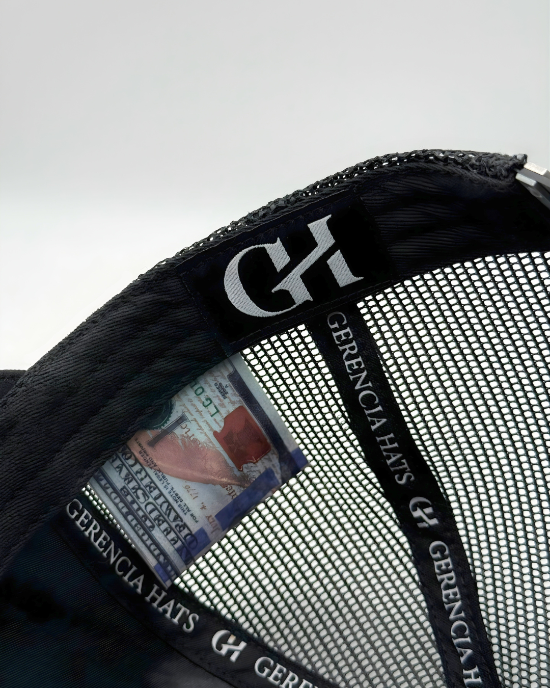 The Legacy Driven hat combines classic trucker style with premium craftsmanship. Its all-black design features a luxurious suede front panel and brim, offering both comfort and durability. Metallic silver stitching adds a refined, high-quality finish, enhancing the hat's sleek look. A metal snapback tag and a metal logo pin on the back provide subtle but distinctive branding details. Inside the mesh panel, a unique dollar bill pattern sets this hat apart, adding an unexpected and original touch that catches the eye. This carefully designed piece balances style, quality, and individuality for an elevated accessory experience.